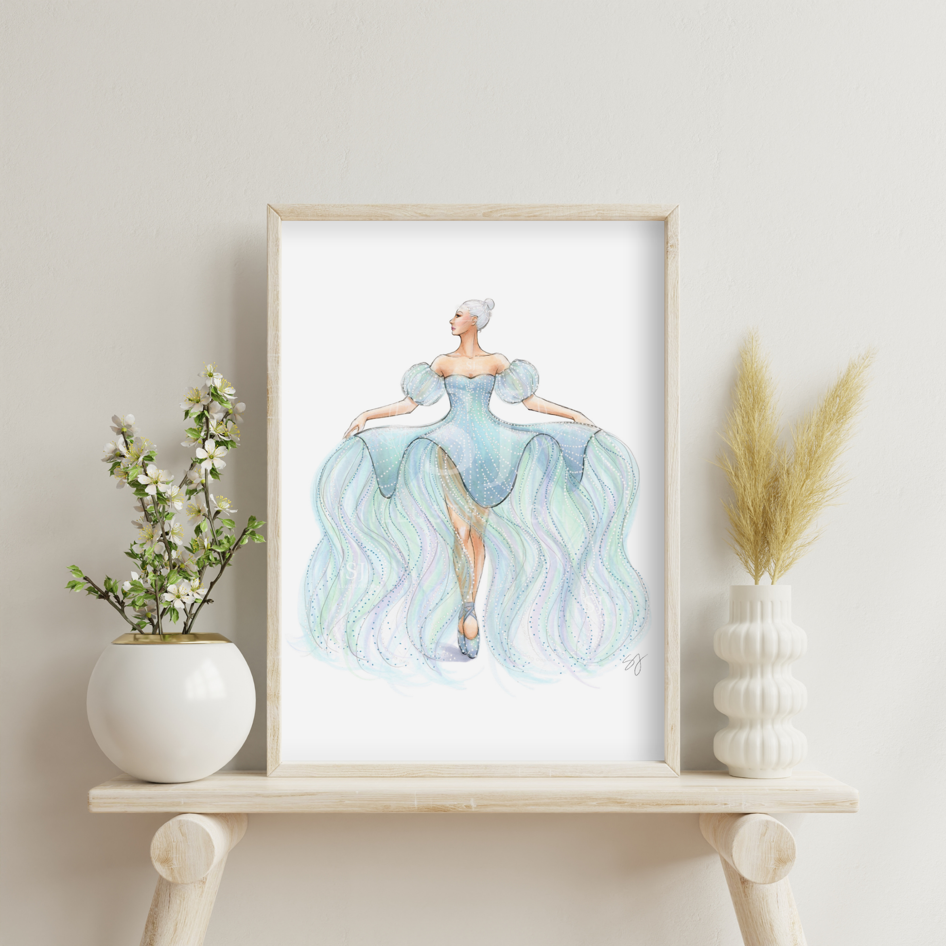 Add a splash of whimsy to your walls with this original ballerina art print. Inspired by the dreamy elegance of a Schiaparelli gown, her pale blue costume exudes an ethereal, underwater feel. A perfect pick for ballet lovers, fashion fans, or anyone who adores a touch of fantasy.